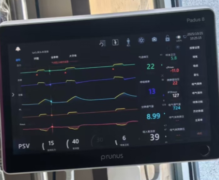 呼吸机的吸气端和呼气端,都有阀和传感器,搜集实时的监测数据,包括管路里的气流量,压力和吸气,呼气的容量变化,并在显示界面上显示。根据实时监测的参数,呼吸机界面呈现出实时描绘的流量,压力,容量的变化波形,以及各种环图,用于评估判断人机互动的情况,以及病人呼吸系统的情况(呼吸力学监测)。