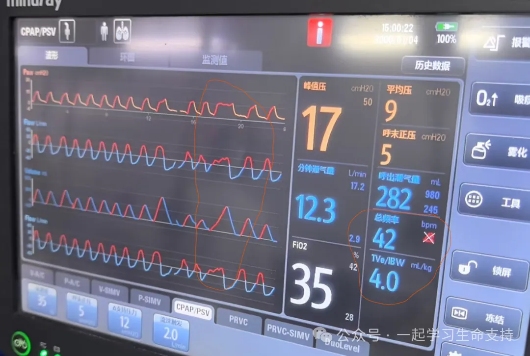 虽然潮气量是小了,看上去还"保护肺"了,但是频率达到29次,波形也是明显可见的压力支持不足,而且从波形可见,病人的呼吸是越来越急促,呼吸驱动和做功都较之前的强(靠波形和频率判断)然后,再过了一会,情况就是这样了: